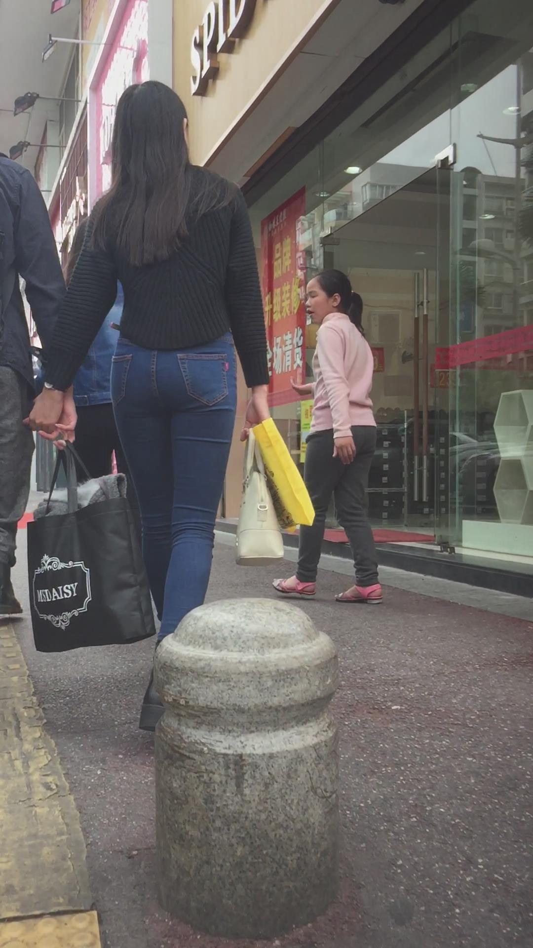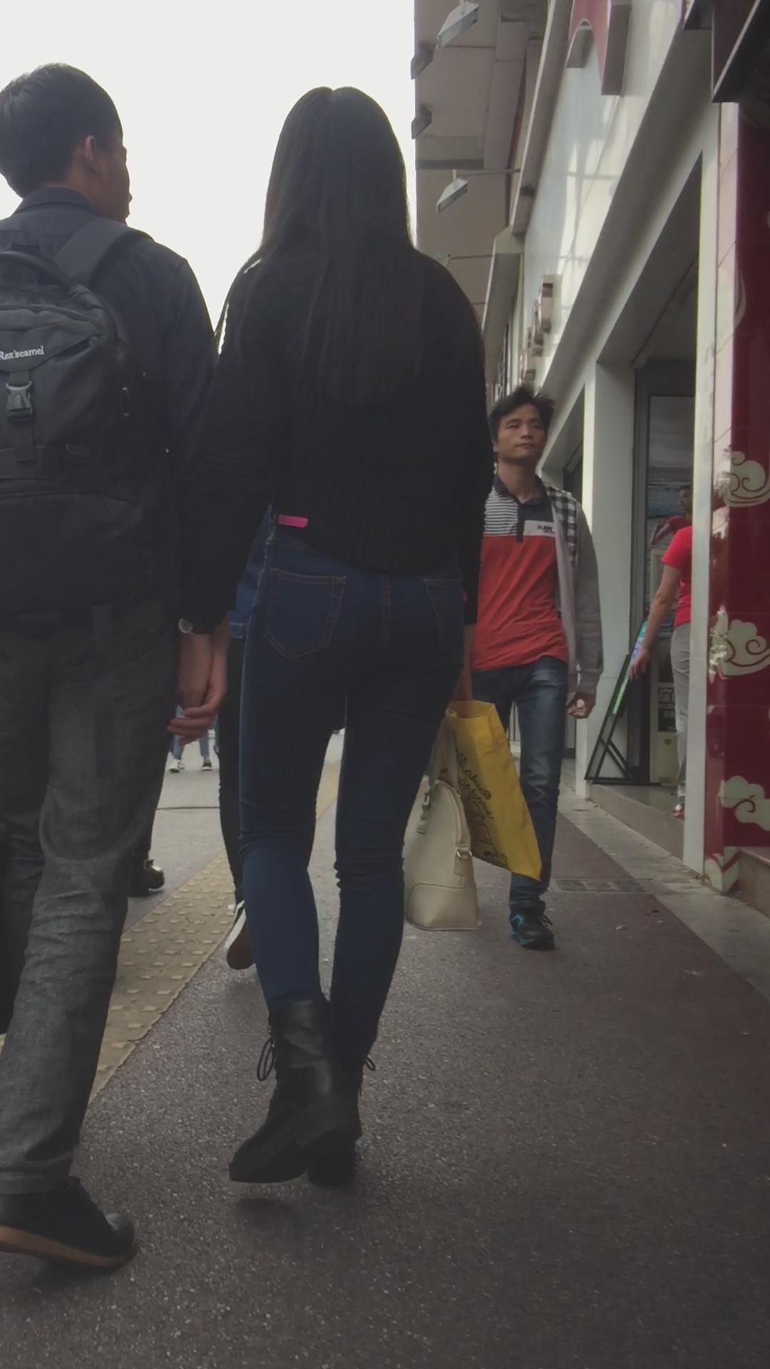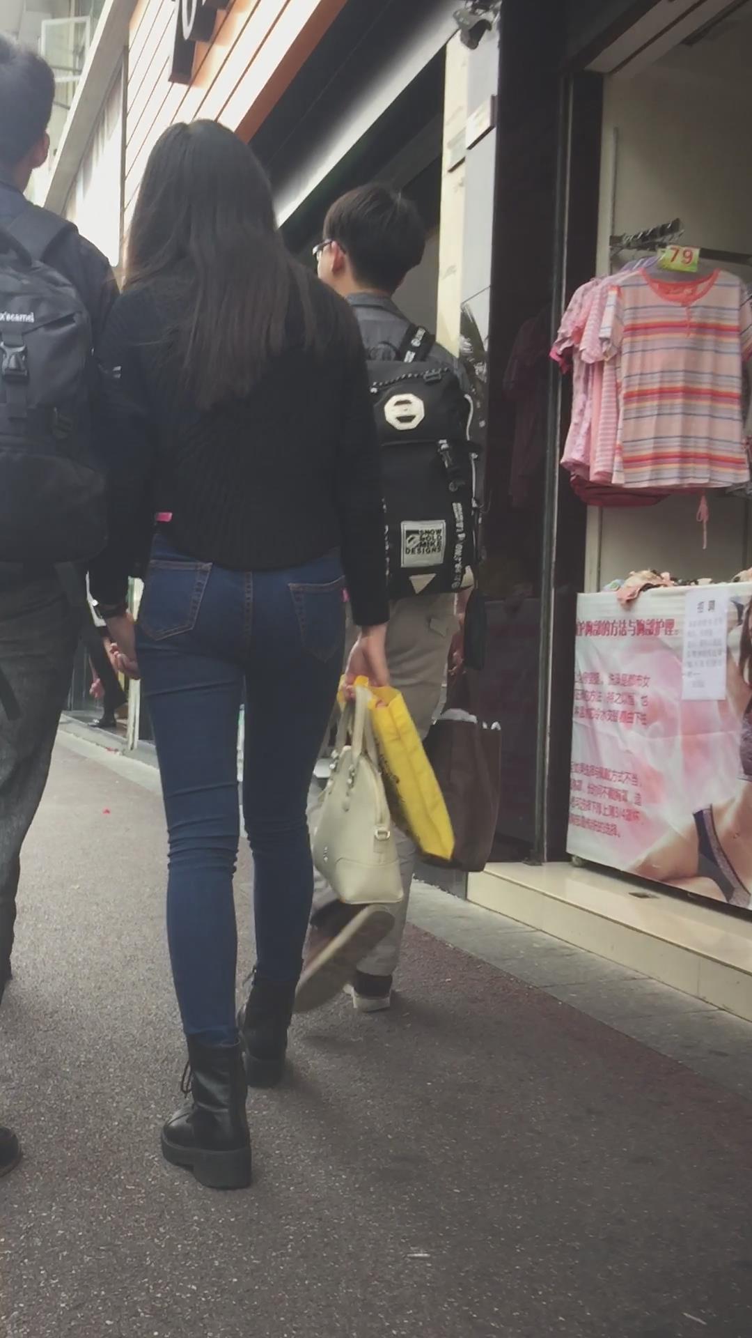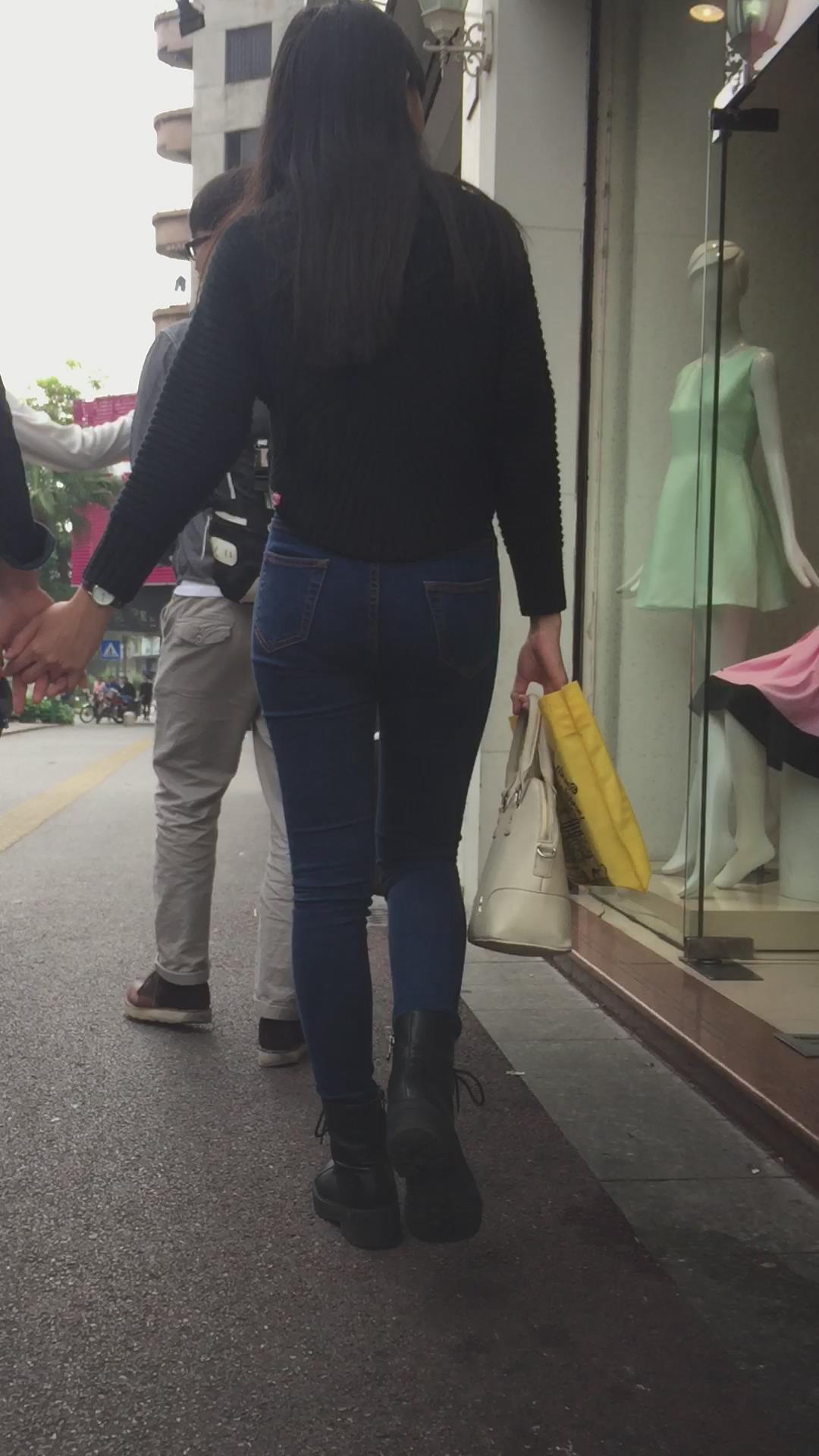 蓝色紧身牛仔裤圆润饱满美臀妹子陪男友逛街 编号6091 |