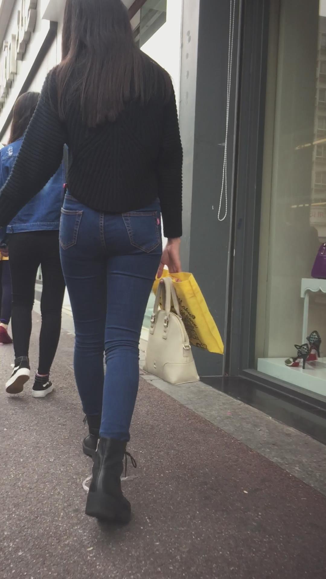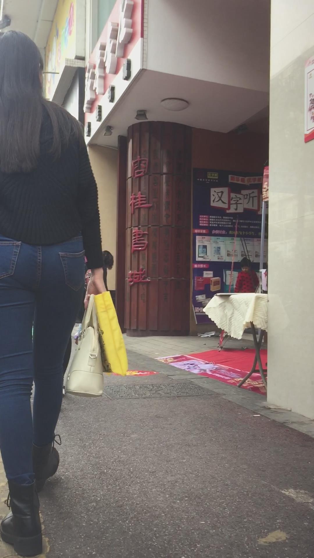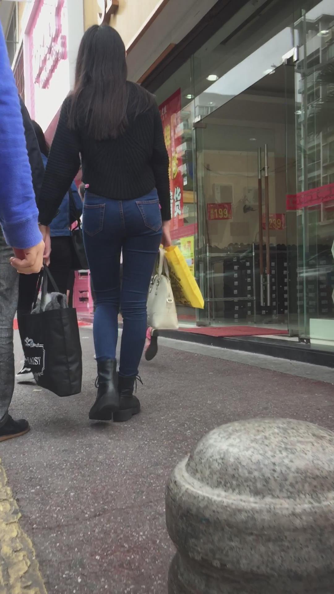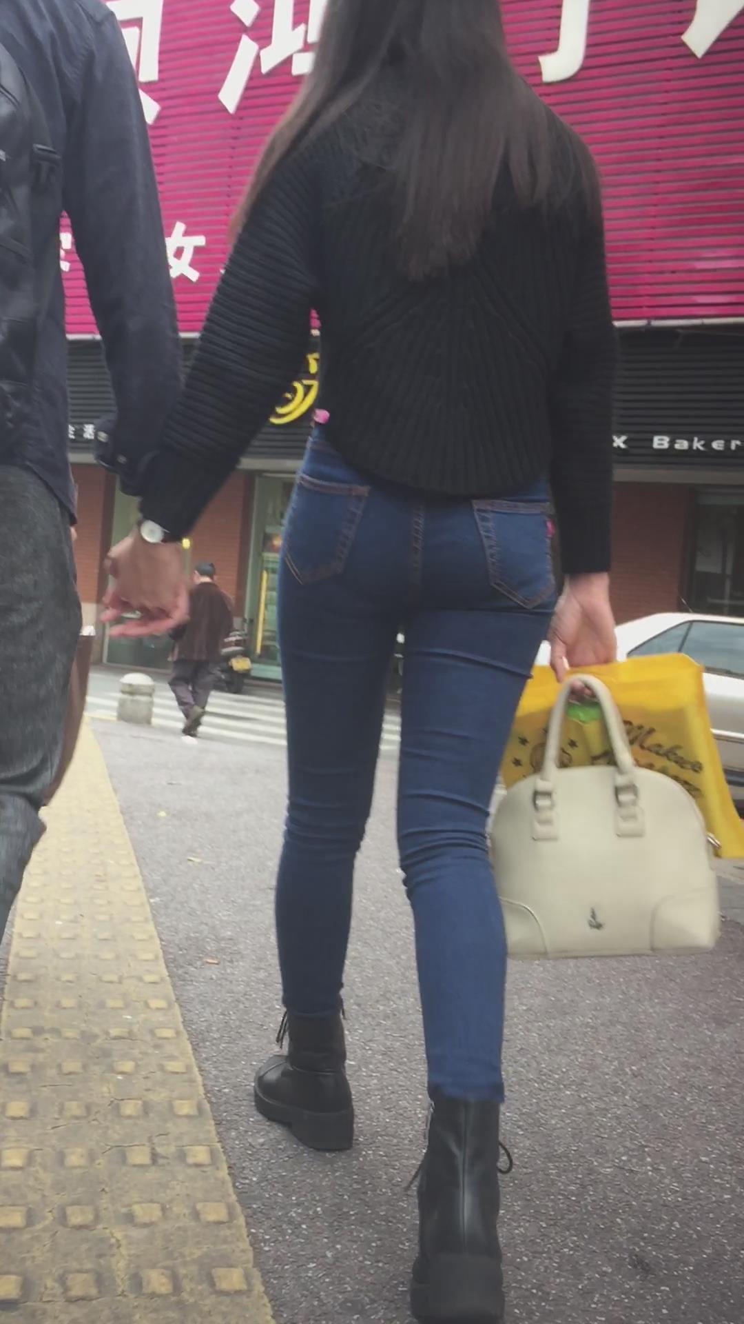 蓝色紧身牛仔裤圆润饱满美臀妹子陪男友逛街 编号6091 |
