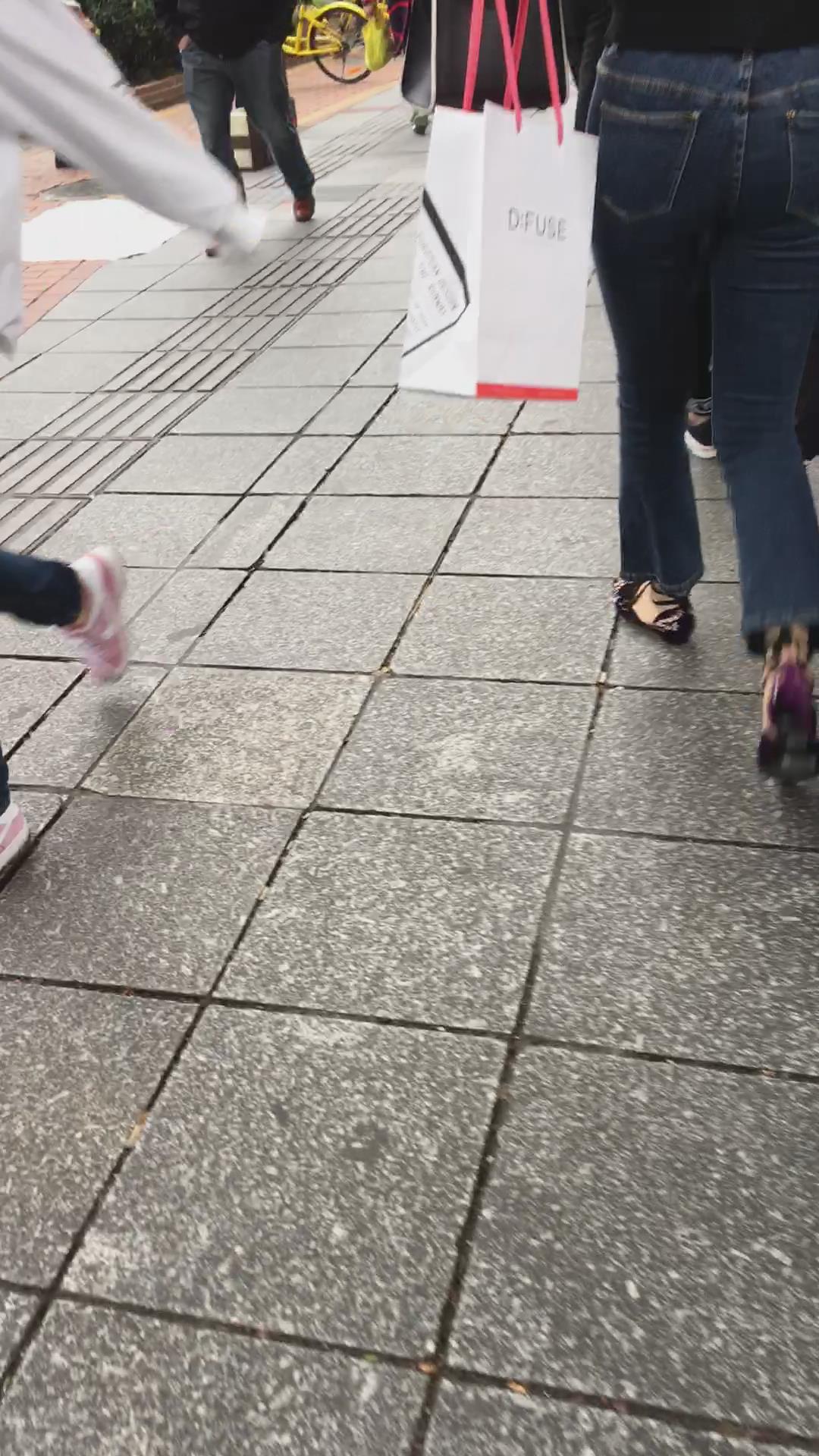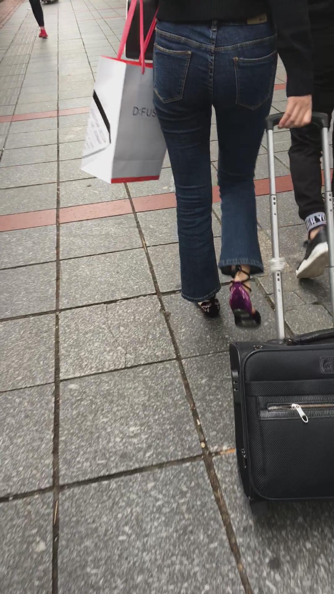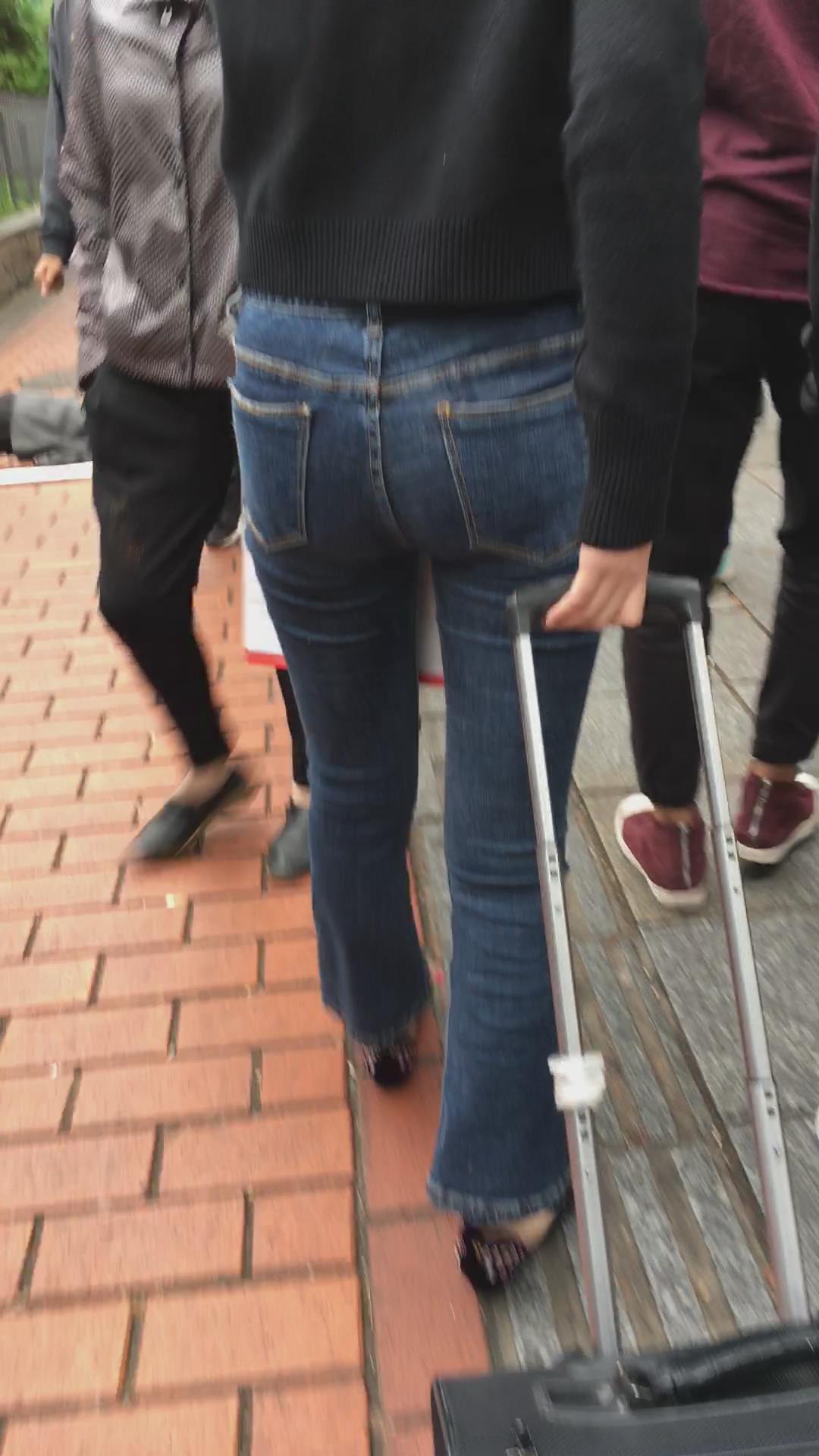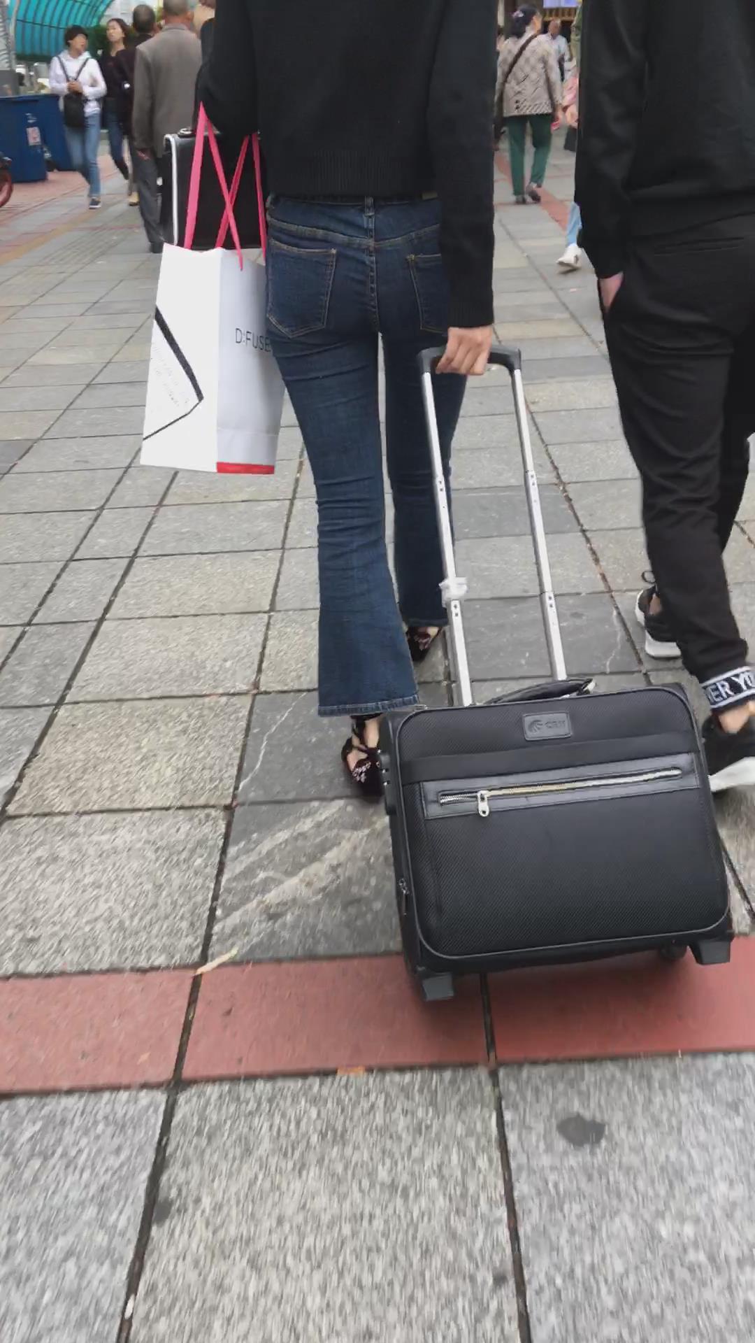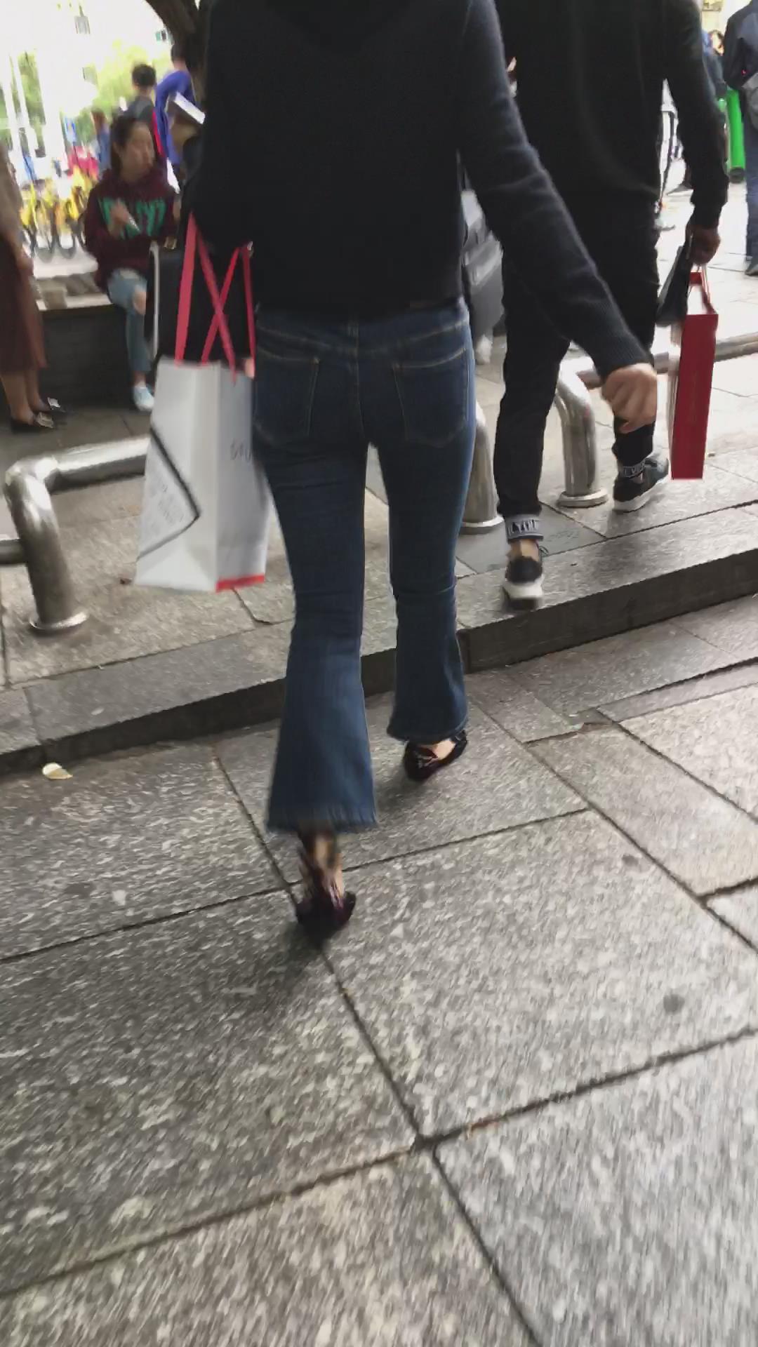 街拍蓝色紧身牛仔裤黑衣服美女 编号5338 |
