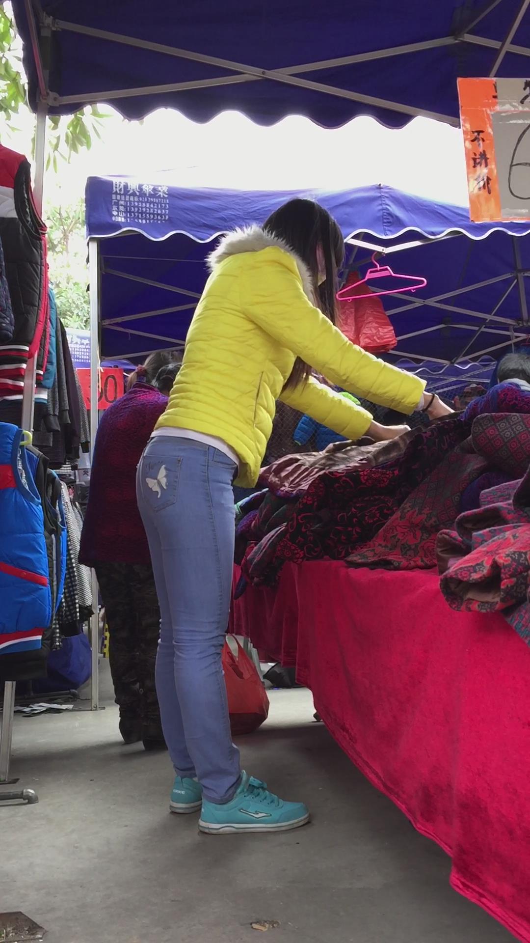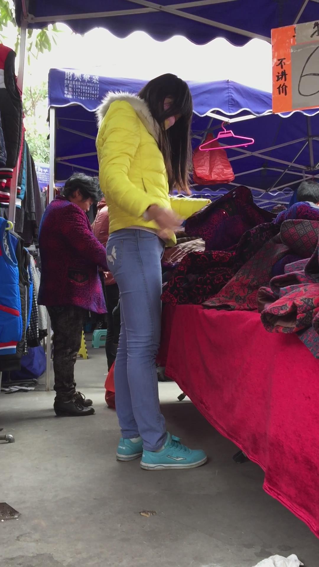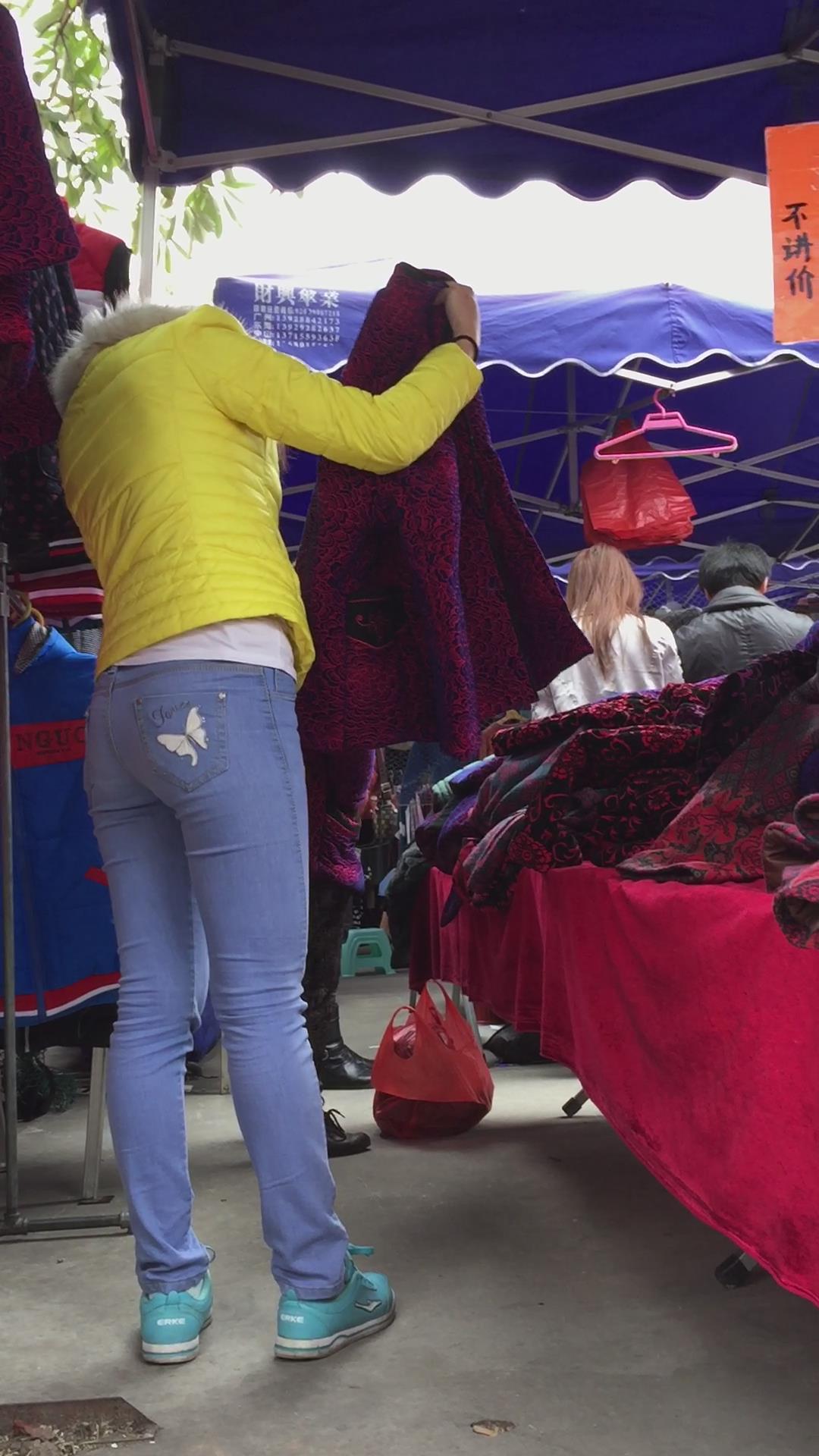 蓝色紧身牛仔小肥妹是个孝顺的孩子,给家里老人买衣服 编号5483 |