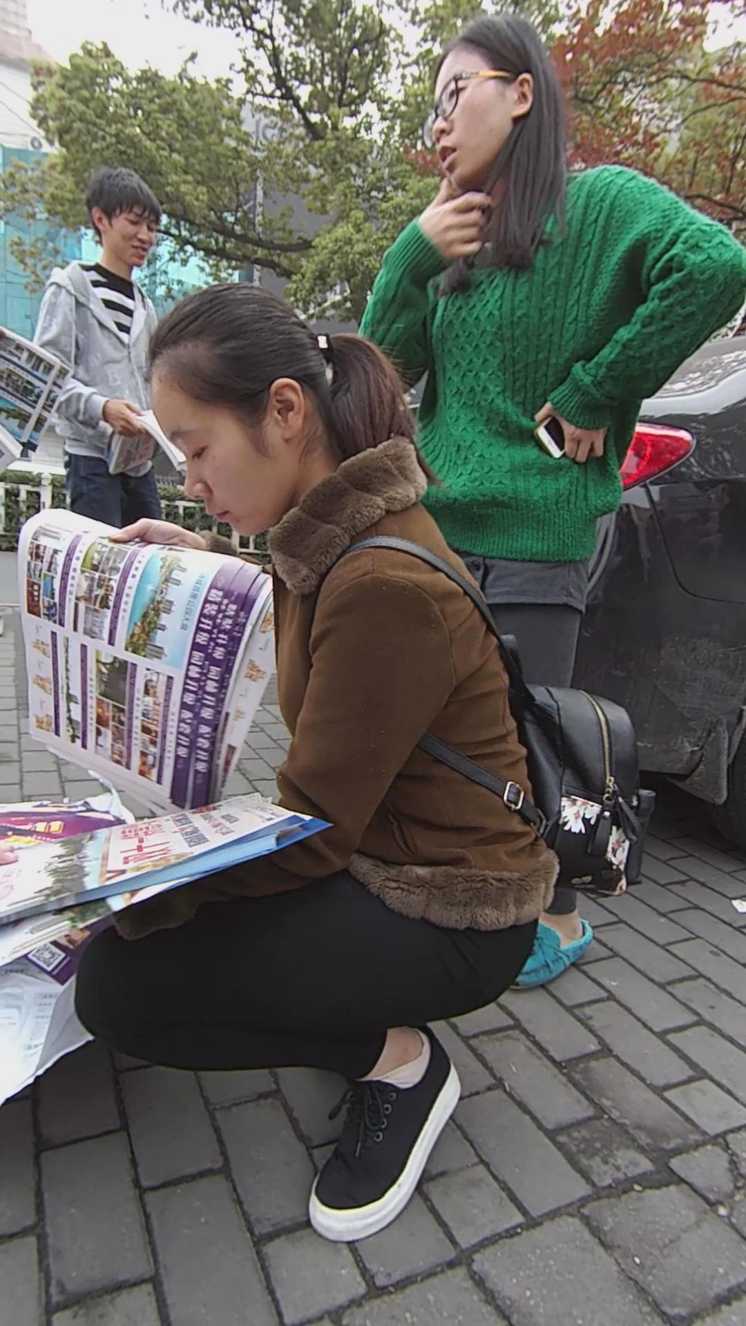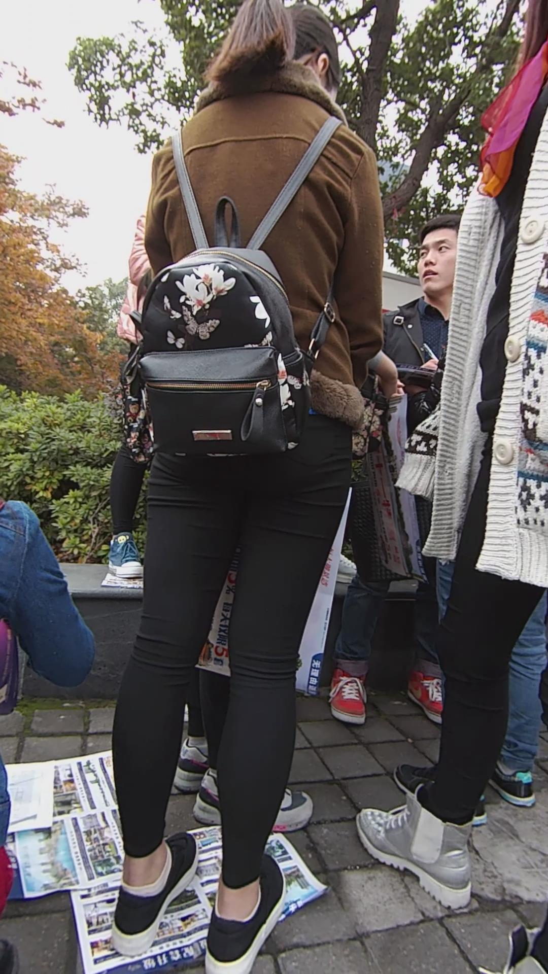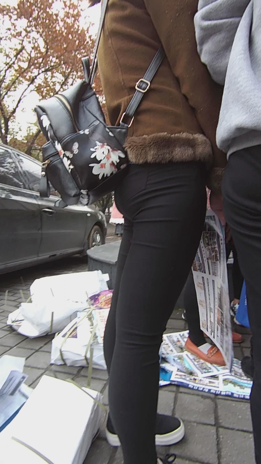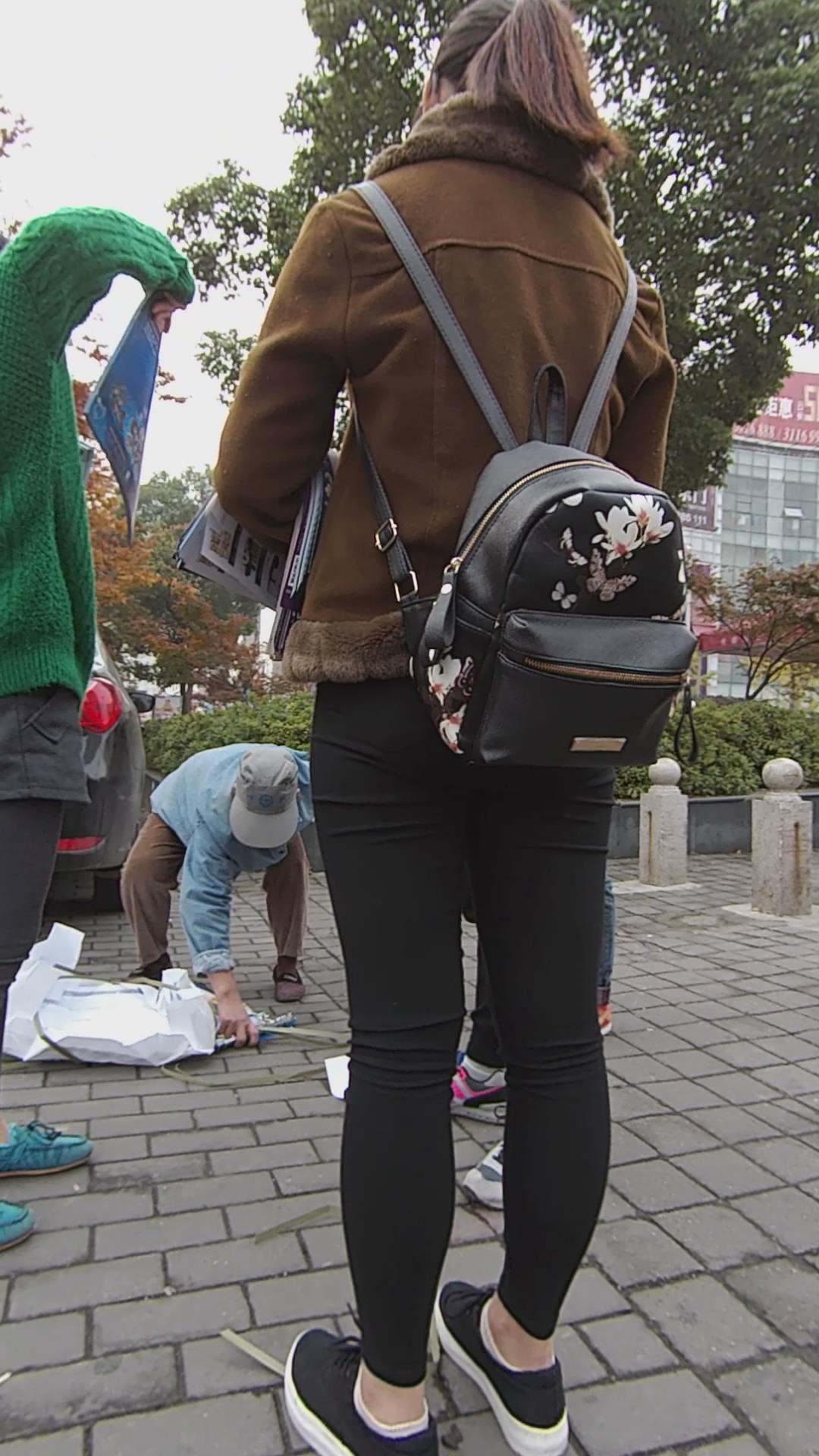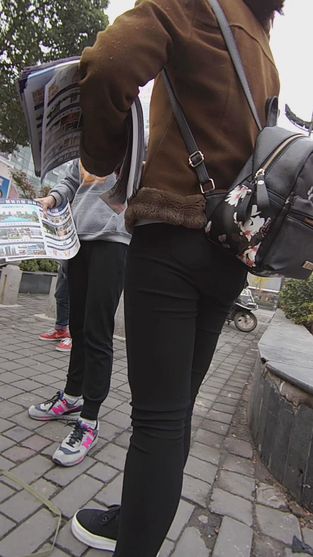 黑色紧身裤宽臀棕色外套学生妹路口发传单 编号5829 |