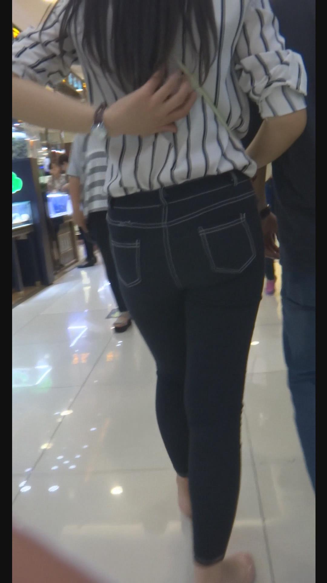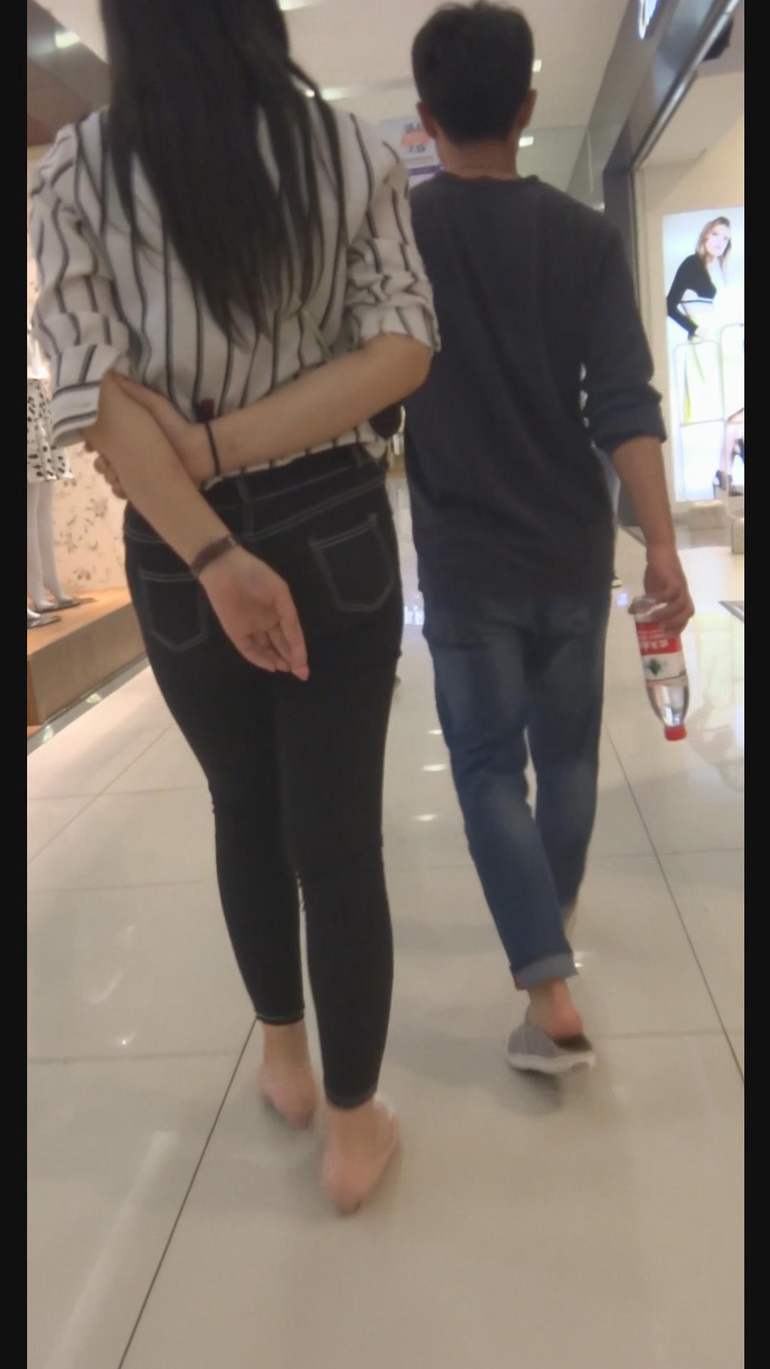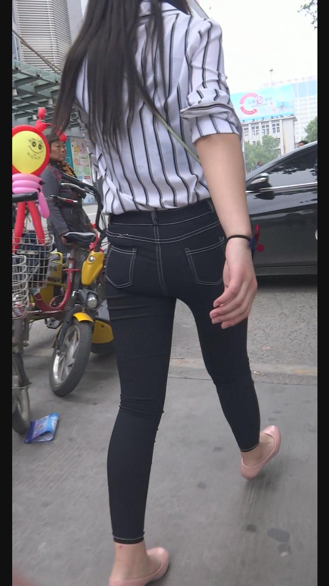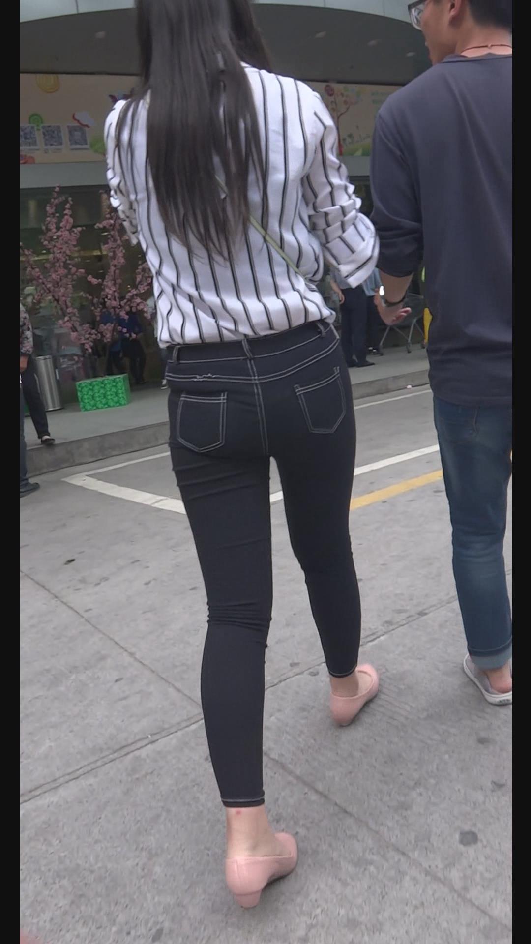 街拍条纹白衬衫紧身黑牛美女陪男友逛街。 编号6000 |