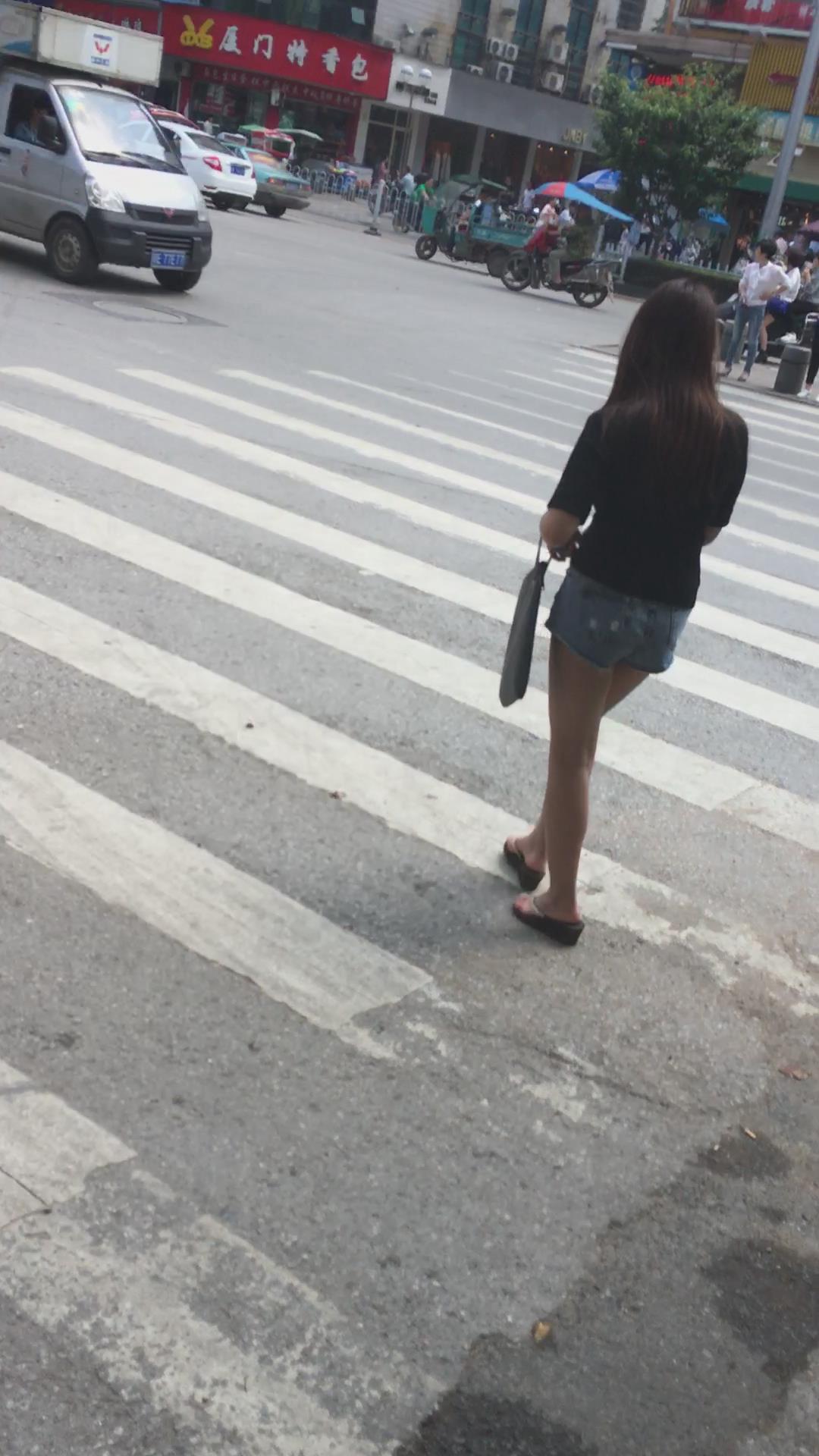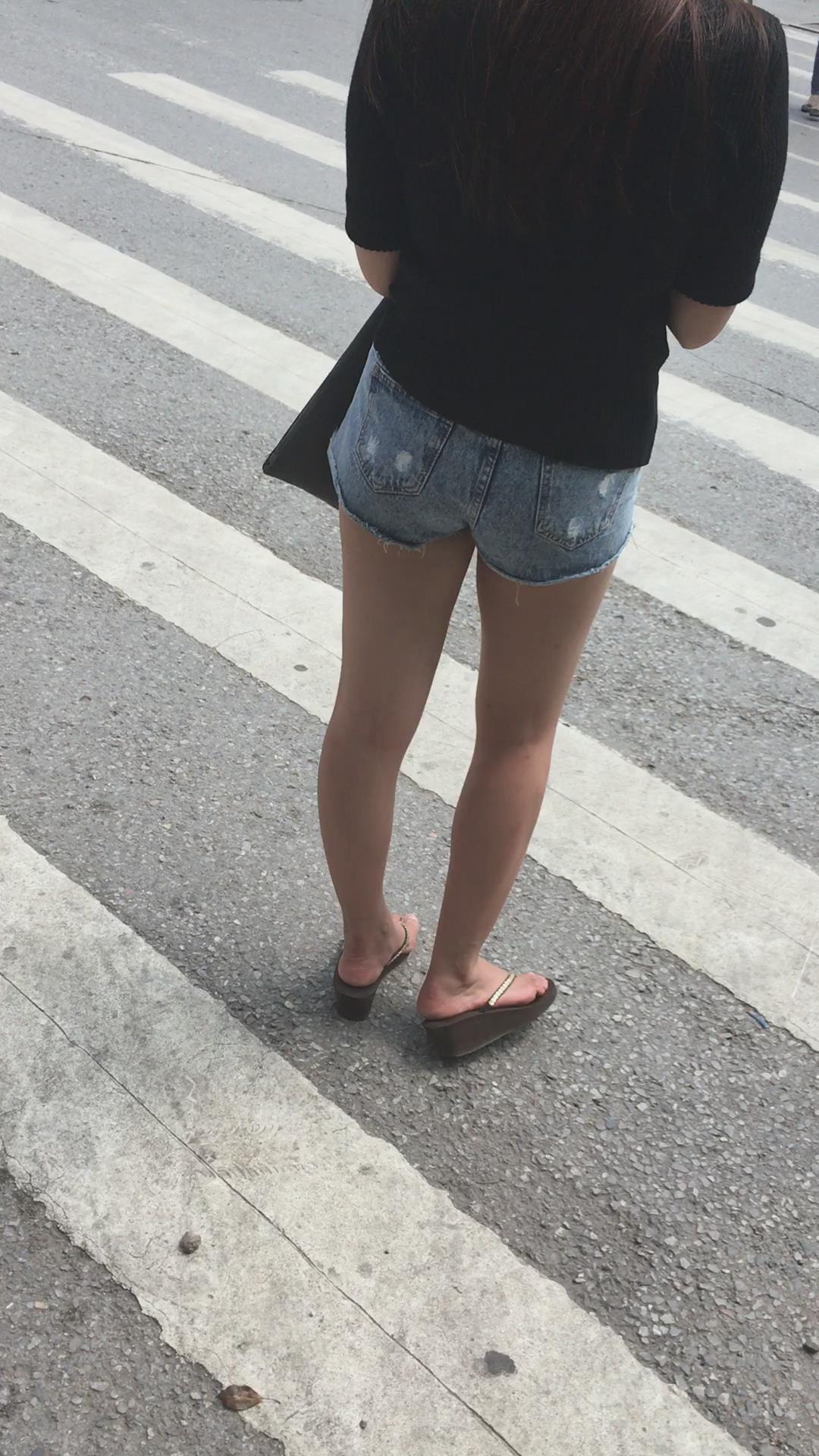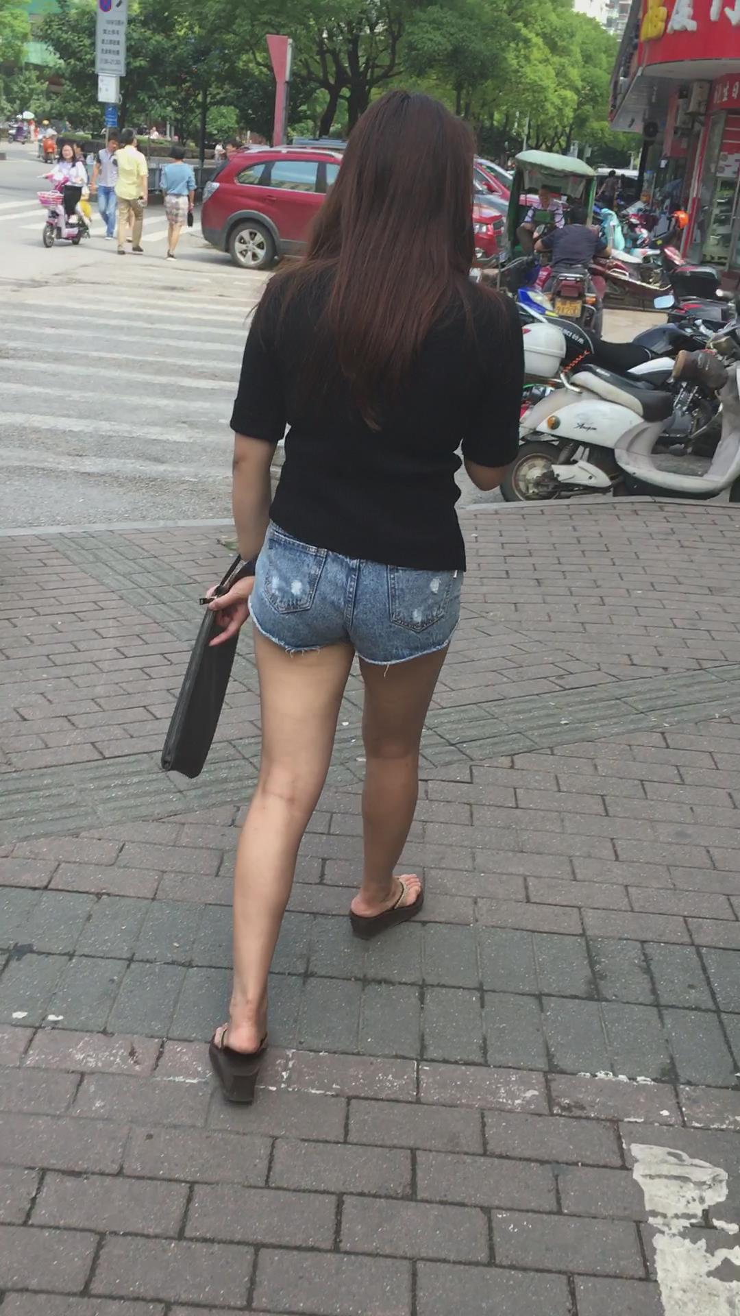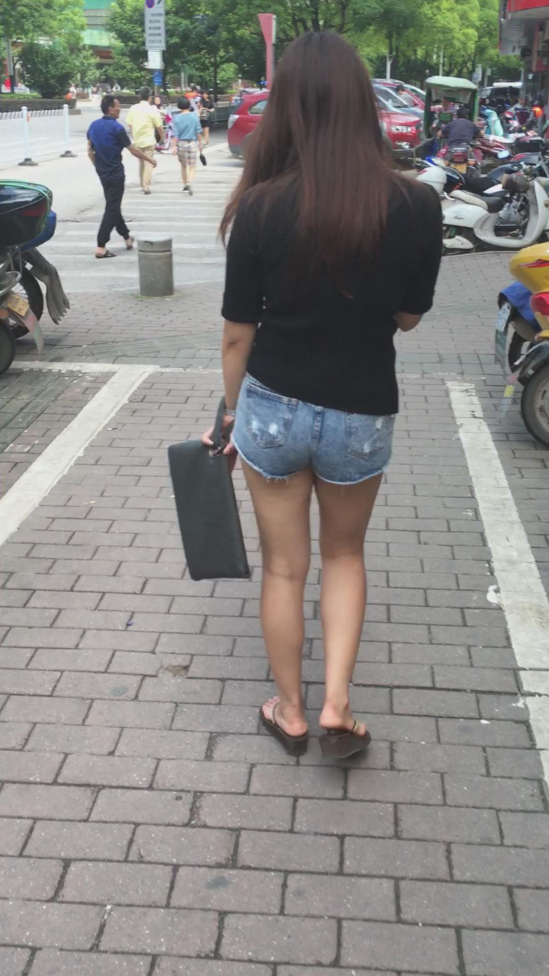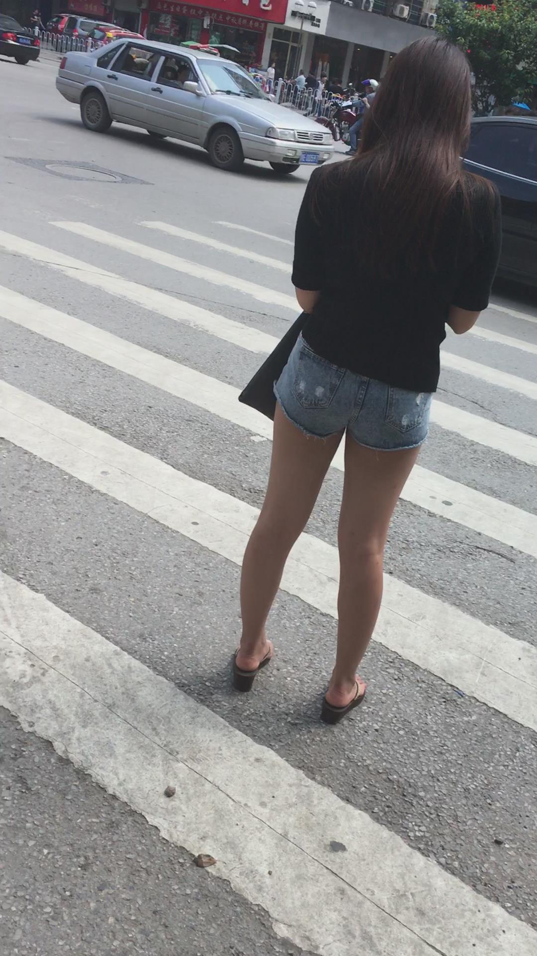 黑T恤超短牛仔热裤街拍圆臀美腿美眉 编号4496 |