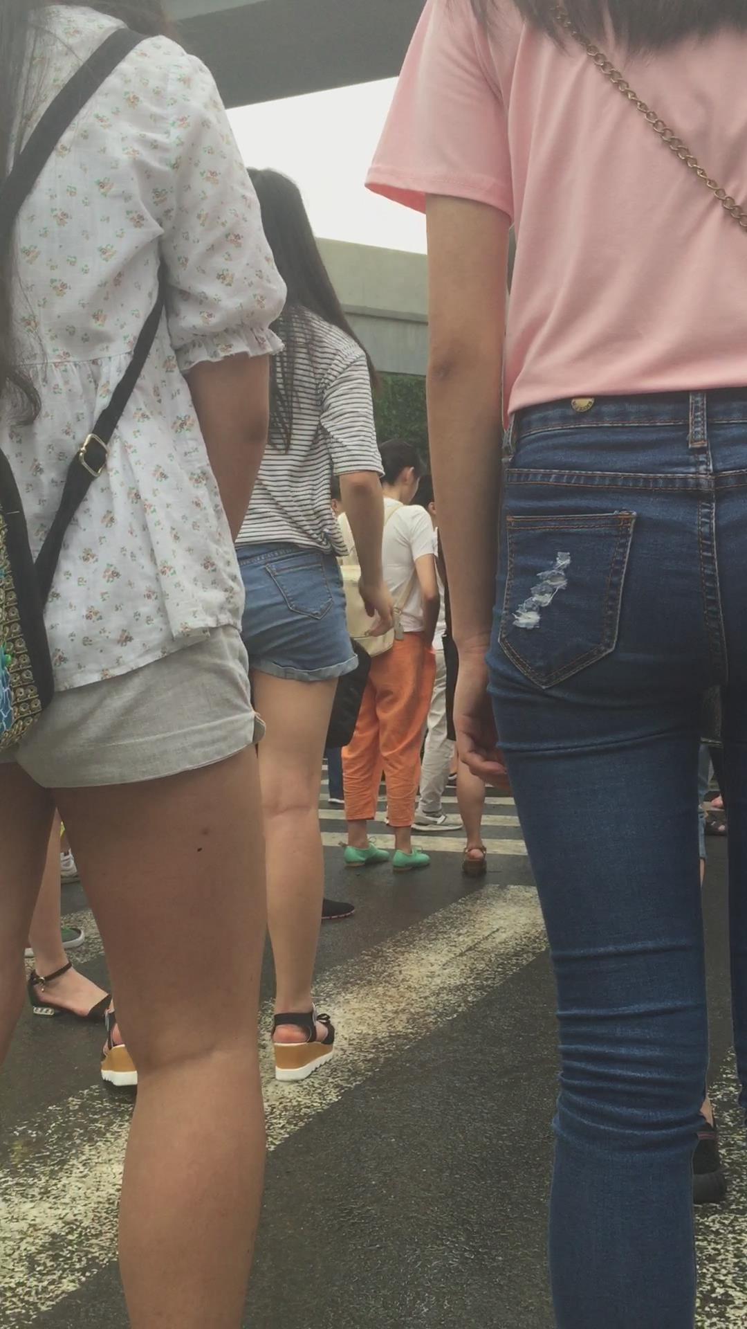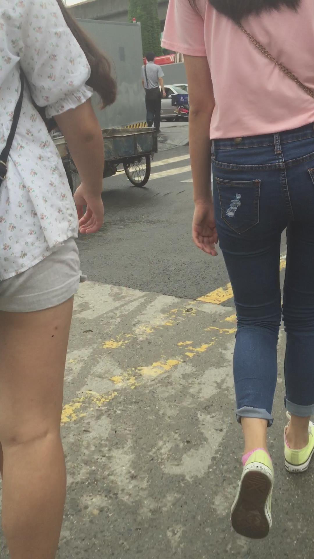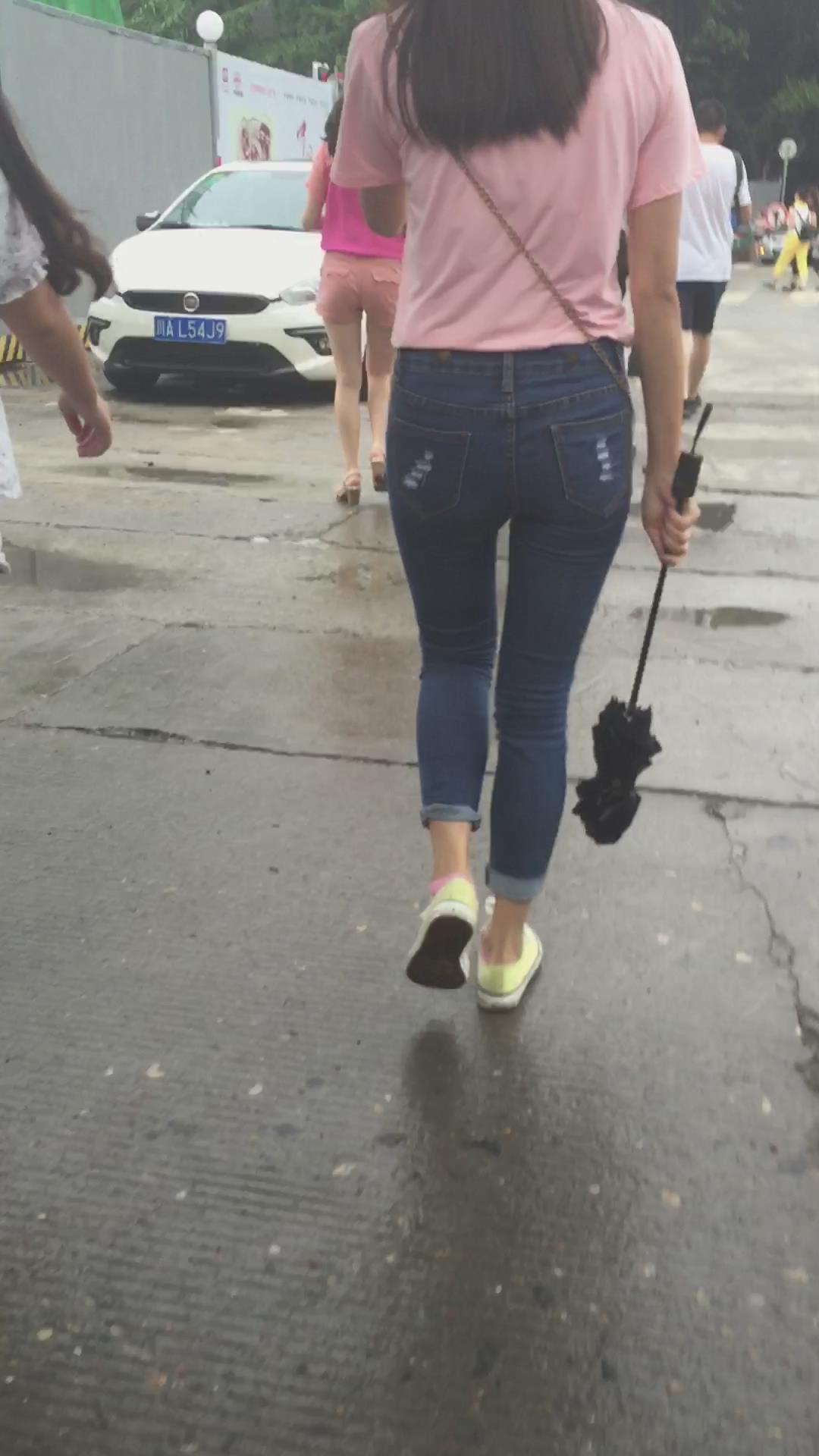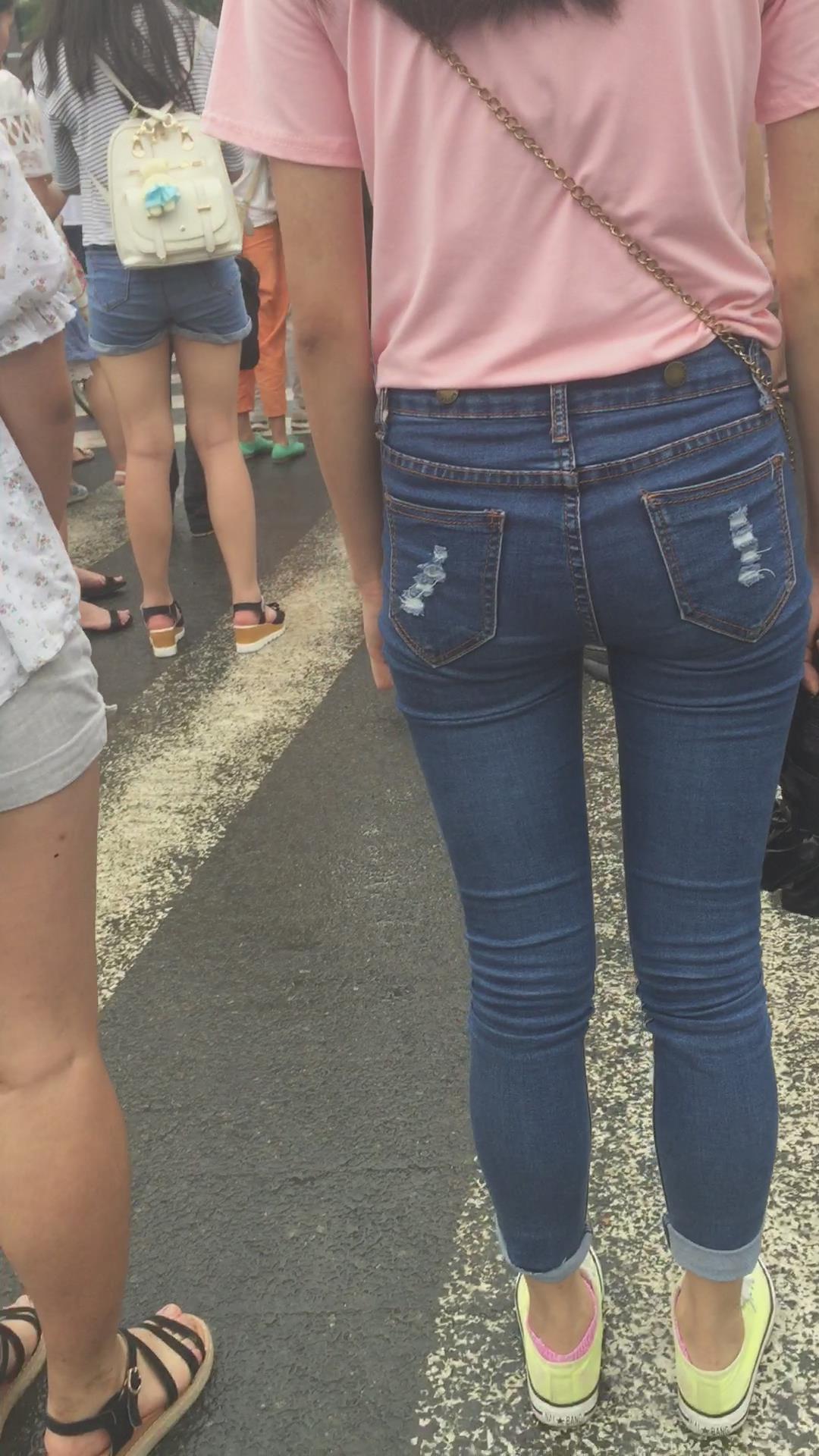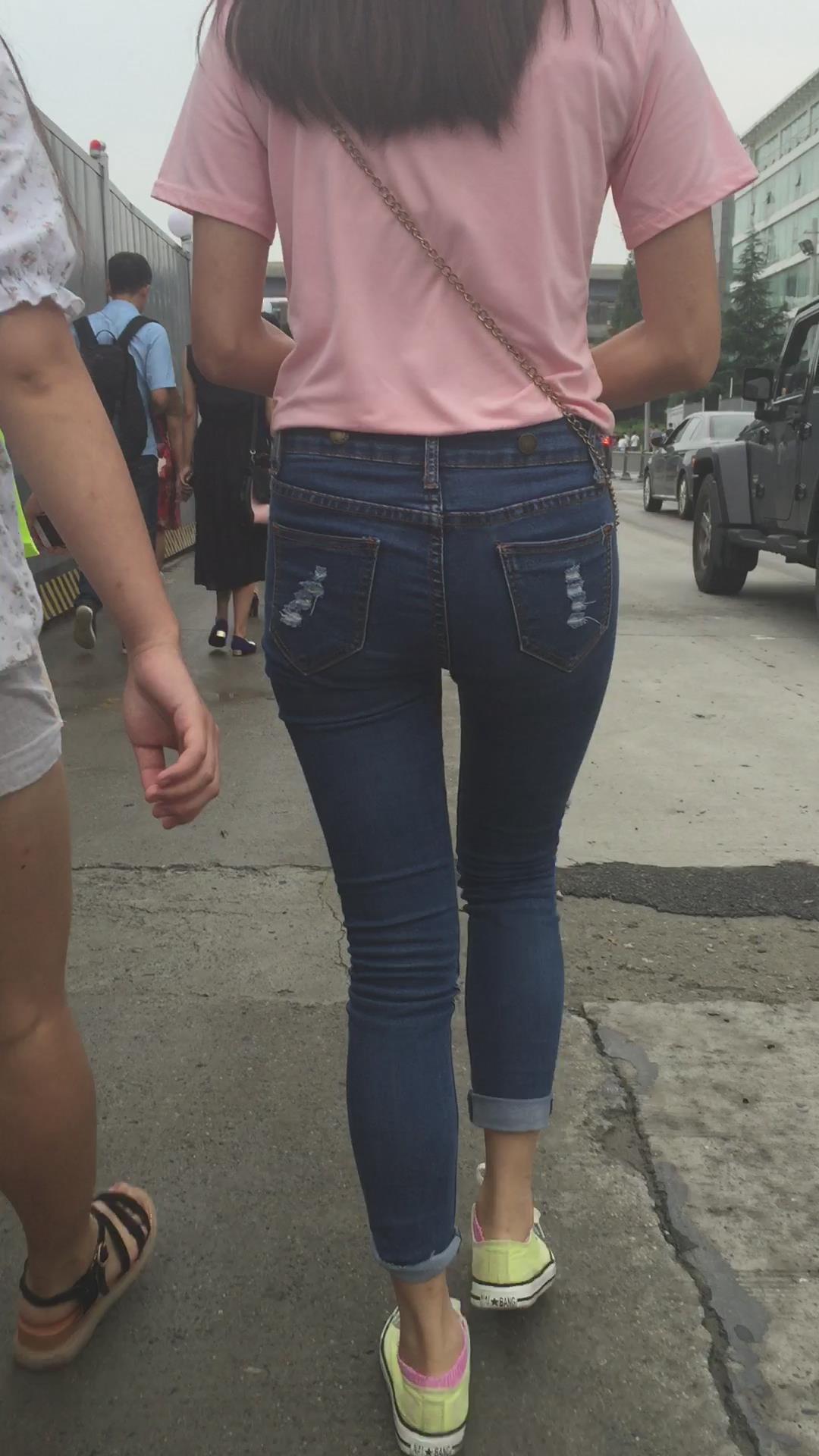 粉色T恤街拍紧身蓝色牛仔裤妹纸 编号6059 |