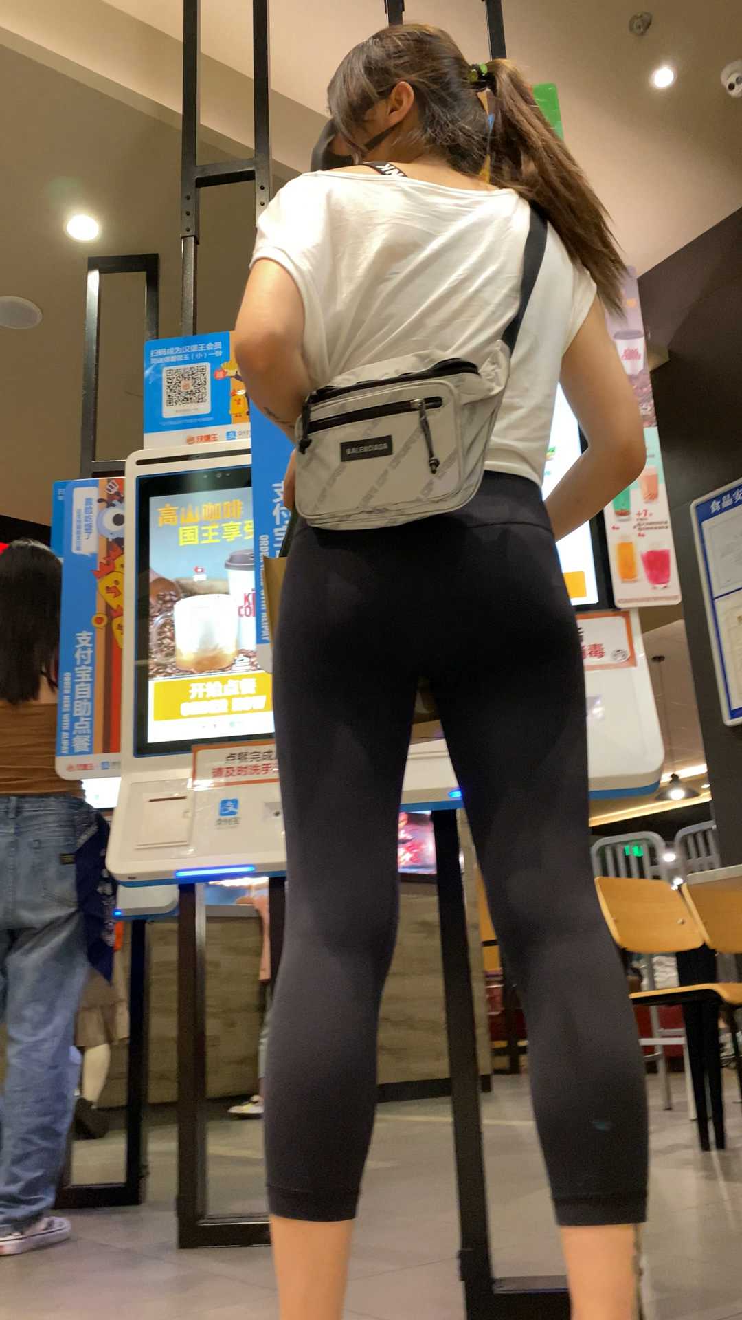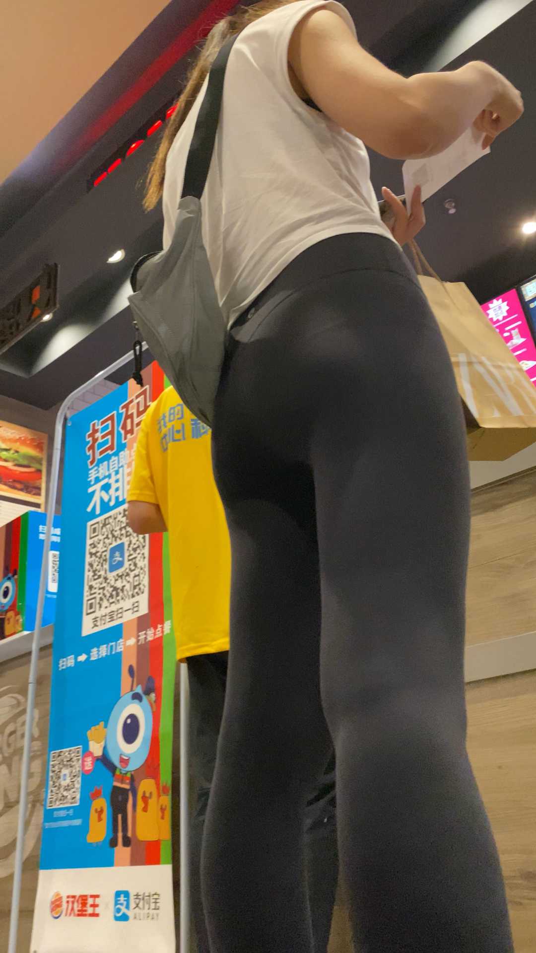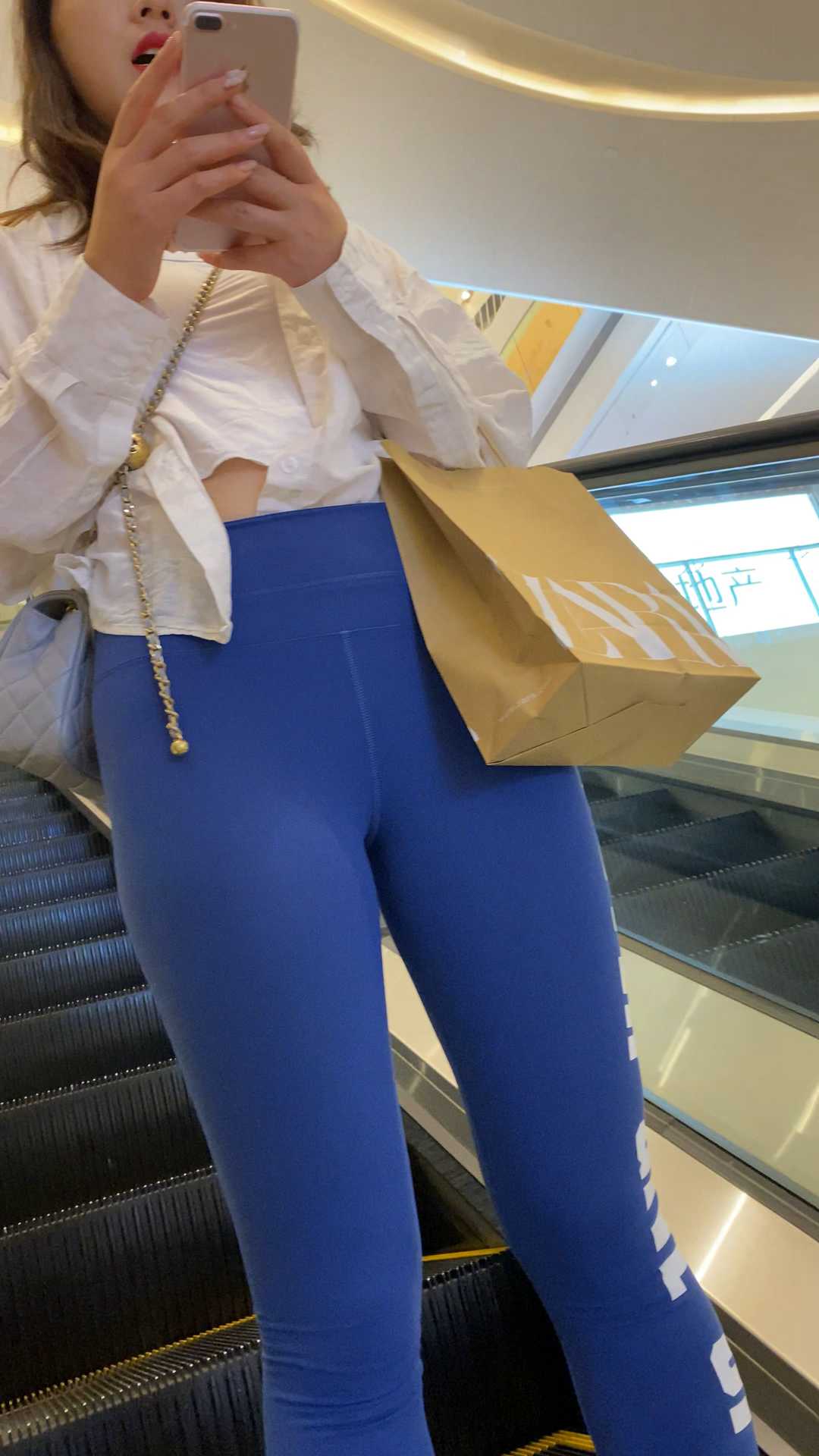 B1137两瑜伽裤妹子逛商场,一灰一蓝,颜色搭配美 |