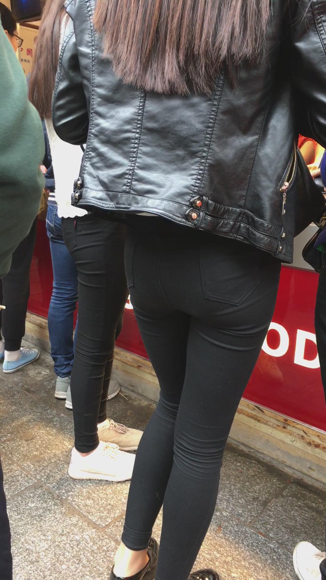 街拍皮衣紧俏美臀紧身黑裤美眉 编号5581 |